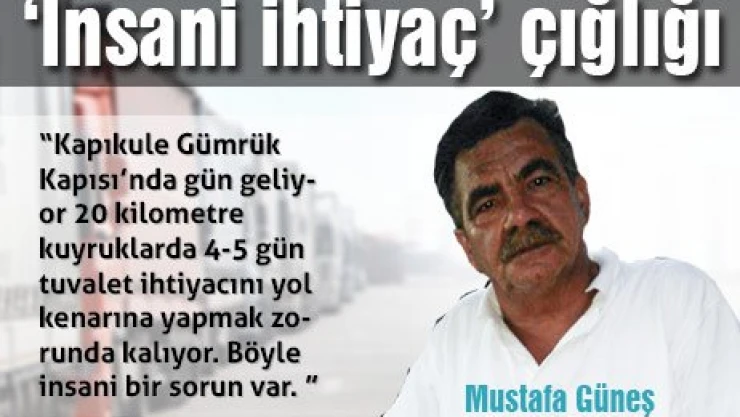 Uluslararası TIR Sürücüleri Yardımlaşma Derneği Başkan Yardımcısı Mustafa Güneş, Kapıkule Gümrük Kapısı ve TIR Parkı'nda uzun süre kuyrukta bekleyen TIR şoförlerinin yaşadığı sıkıntılarla ilgili basın açıklaması yaparak 'TIR şoförü arkadaşlarımız, Kapıkule Gümrük Kapısı'nda gün geliyor 20 kilometre kuyruklarda 4-5 gün tuvalet ihtiyacını yol kenarına yapmak zorunda kalıyor. Böyle insani bir sorun var. İkinci sorun ise yeme, içme ve gıda. Kapıkule Gümrük Kapısı'nın bulunduğu alanda böyle geniş alanlar varken neden kullanılmıyor?' dedi.
