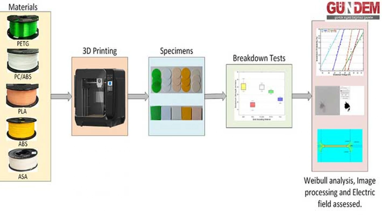 Araştırmada PLA, ABS, ASA ve PETG gibi yaygın termoplastik malzemeler; Kısmi boşalma başlangıç gerilimi (PDIV) Dielektrik kayıp (tanδ) Delinme gerilimi parametrelerinde test edildi.