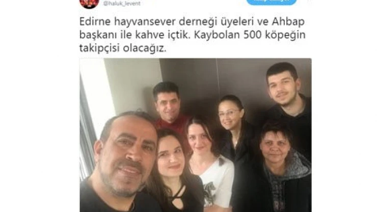 Levent, sosyal medyadan yaptığı açıklamada; 'Edirne hayvansever derneği üyeleri ve Ahbap başkanı ile kahve içtik. Kaybolan 500 köpeğin takipçisi olacağız' dedi.
