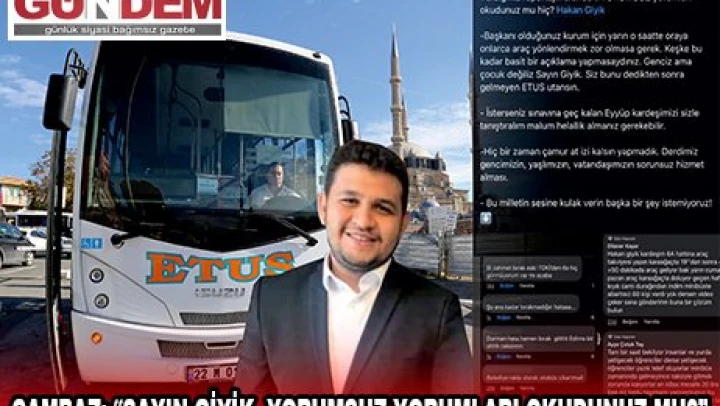 Toplu Ulaşım Sistemi (ETUS) Başkanı Hakan Giyik'in haberlerinin altına sistemin düzensiz çalıştığına yönelik yüzlerce eleştirel yorum gelmesi sonrası sosyal medya hesabından paylaşım yapan AK Parti Edirne İl Gençlik Kolları Başkanı Burak Cambaz, 'Verdiğiniz röportajın altındaki YORUMSUZ yorumları okudunuz mu hiç?' diyerek Giyik'e seslendi.