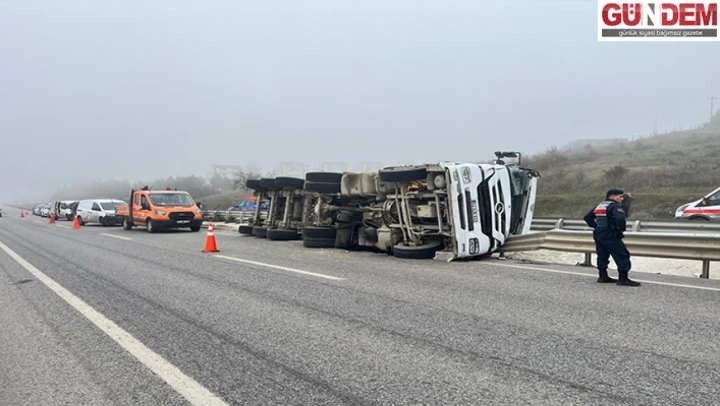 D100'de asfalt yüklü tır devrildi