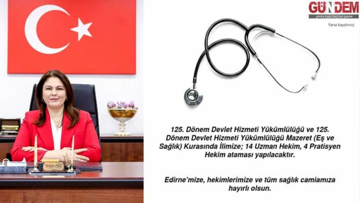 AK Parti Edirne İl Başkanı Belgin İba, sosyal medya hesabı üzerinden yaptığı paylaşımla Edirne'de sağlık alanında yapılan atamalara ilişkin önemli bir gelişmeyi kamuoyu ile paylaştı. İba paylaşımında, '125. Dönem Devlet Hizmeti Yükümlülüğü ve 125. Dönem Devlet Hizmeti Yükümlülüğü Mazeret (Eş ve Sağlık) Kurasında İlimize; Kamu Hastanelerine, Merkez Toplum Sağlığı Merkezine, Acil Sağlık Hizmetleri İstasyonlarına ve Trakya Üniversitesine 14 Uzman Hekim, 4 Pratisyen Hekim ataması yapılacaktır' ifadelerine yer verdi.