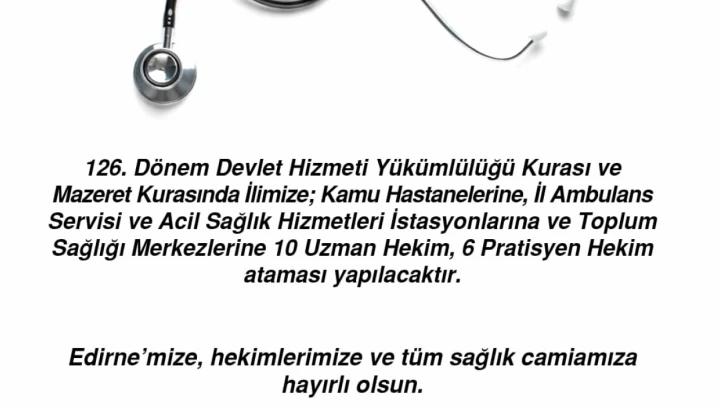 Yapılan açıklamada, 126. Dönem Devlet Hizmeti Yükümlülüğü Kurası ve Mazeret Kurası kapsamında Edirne'ye yeni sağlık personeli kazandırılacağı belirtildi. Buna göre; kamu hastaneleri, İl Ambulans Servisi ve Acil Sağlık Hizmetleri İstasyonları ile Toplum Sağlığı Merkezlerinde görevlendirilmek üzere 10 uzman hekim ve 6 pratisyen hekimin ataması gerçekleştirilecek.