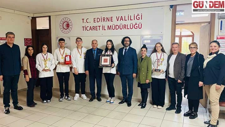 Kırşehir'deki yarışmada gösterdikleri başarıdan dolayı 'Ahi Sancağı Ödülü'ne layık görülen öğrenciler, Yiyecek İçecek Hizmetleri Alanı öğretmenleri ve Okul Müdürü İlhan Dinç ile birlikte Edirne Ticaret İl Müdürü Mustafa Kurt'u ziyaret etti.