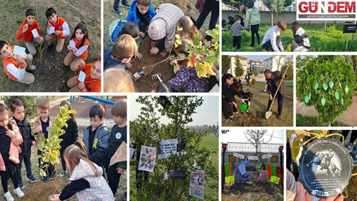 Etkinliklere aileleriyle katılan minik öğrenciler, küreklerle toprağı kazarak fidanları yerleştirdi, ardından Atatürk'ün fotoğraflarını, 'Ormansız ve ağaçsız toprak vatan değildir.' ve 'Çevreyi korumak aklın gereğidir.' sözlerinin yazılı olduğu kartları fidanlara astı.