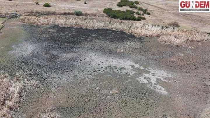 Göletin kuruyan zemininde derin çatlaklar oluştu, bazı bölümleri ise sazlıklarla kaplandı.