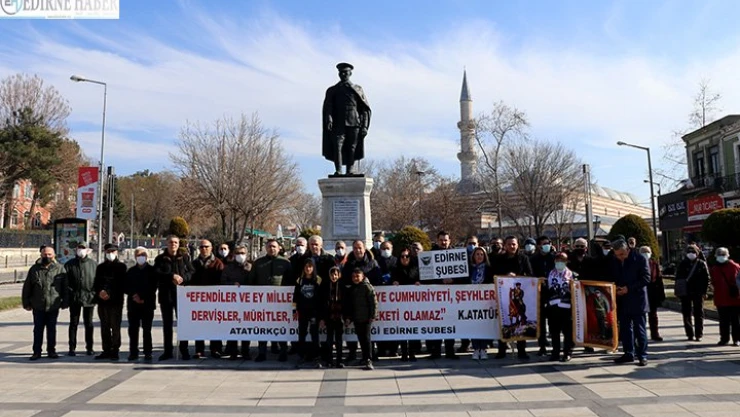 Saraçlar Caddesi'ndeki Atatürk Anıtı önünde bir araya grup, Mustafa Kemal Atatürk'ün "Efendiler ve ey millet, iyi biliniz ki, Türkiye Cumhuriyeti şeyhler, dervişler, müritler, meczuplar memleketi olamaz." sözünün olduğu pankart açtı.