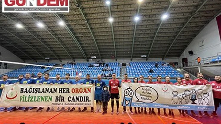 Edirne'de düzenlenen kurumlar arası voleybol müsabakasında sporcular sahaya aşı ve organ bağışı mesajı içeren pankartlarla çıktı.