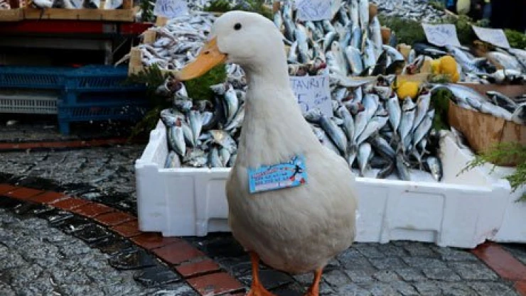 Edirne'de kesilmek üzereyken balıkçılar tarafından satın alınarak sahiplenilen 'Beti' isimli ördek, balık pazarının maskotu oldu.