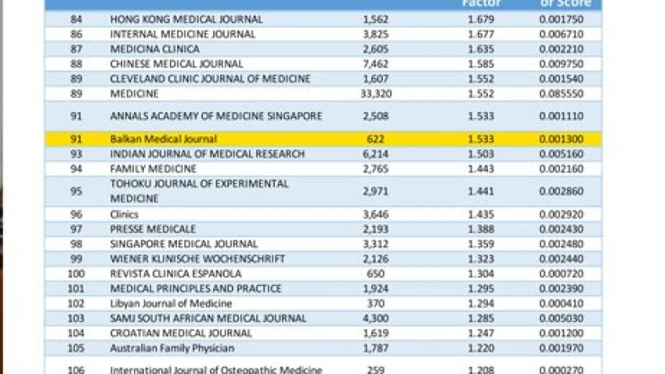 Yayın kalitesiyle dünya çapında uluslararası tanınırlığa sahip olan Balkan Medical Journal, etki faktörlerinin açıklandığı 'Journal Citations Reports 2020' başlıklı raporda, Türkiye ve Balkan ülkelerindeki pek çok tanınmış dergiyi geride bırakarak üstün bir başarı elde etti. Ülkemizde ve dünyada, geniş okuyucu kitlesi ve yüksek etki faktörü ile saygın dergiler arasında kabul gören Balkan Medical Journal'ın, Journal Citations Reports 2020 raporuna göre 2019 Etki Faktörü 1,533 olarak açıklandı. 2007 yılında SCIE'da, 2014 yılında PubMed Central'de ve 2016 yılında da PubMed/Medline'da indekslenme başarısı gösteren Balkan Medical Journal, bu sonuç ile geçen yıla göre etki faktörünü yüzde 27 oranında yükseltme başarısı göstererek, Türkiye ve Balkanlarda 'Genel Tıp' kategorisinde yayımlanan dergiler arasında birinci sırada yer aldı.