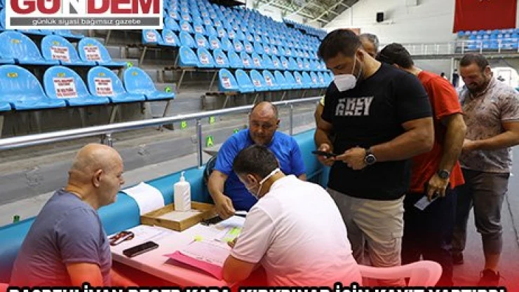 Kırkpınar Yağlı Güreşleri için Mimar Sinan Spor Salonu'nda hazırlanan kayıt platformuna gelen Recep Kara, görevliler ve pehlivanlarla selamlaştı, ardından PCR testini göstererek kayıt yaptırdı.
