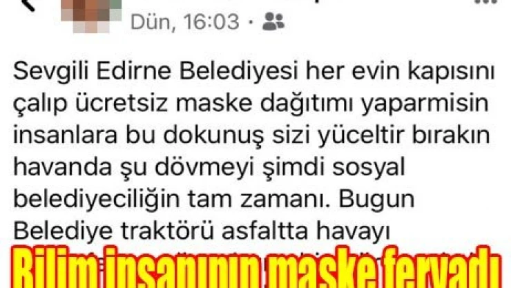 Prof. Dr. Yılmaz Çamlıtepe, sosyal medya üzerinden gerçekleştirdiği açıklama ile Edirne Belediyesi'ni korona virüsü tedbirleri kapsamında kentteki tüm evlere maske dağıtmaya davet etti. Çamlıtepe, açıklamasında sosyal belediyeciliğe dikkat çekerken 'Bırakın havanda su dövmeyi, şimdi sosyal belediyeciliğim tam zamanı' dedi.