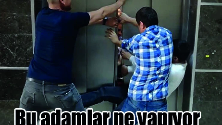 Üç genç adam asansörün kapalı olan kapısını çekiştiriyor.