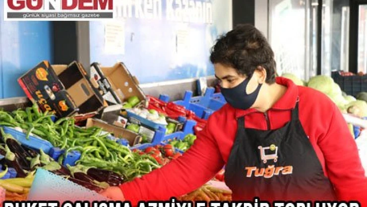 Çocukken geçirdiği rahatsızlık nedeniyle yüzde 70 zihinsel engeli olan 21 yaşındaki Buket, 3 yıldır görev yaptığı markette çalışkanlığı ve güler yüzüyle dikkati çekiyor. İş yerinin sebze ve meyve reyonunda görevli Çalış, alışverişe gelenlerin aldığı ürünleri tartıp etiket yapıştırıyor.
