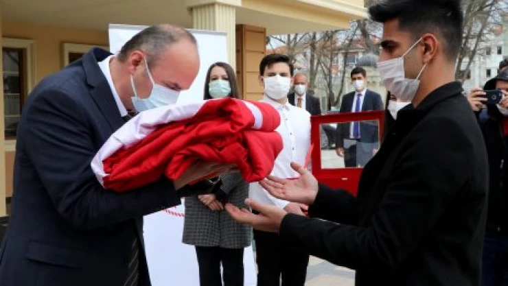 düzenlenen törenle çocuk sitesinde kalan bir gence verdiği Türk bayrağının