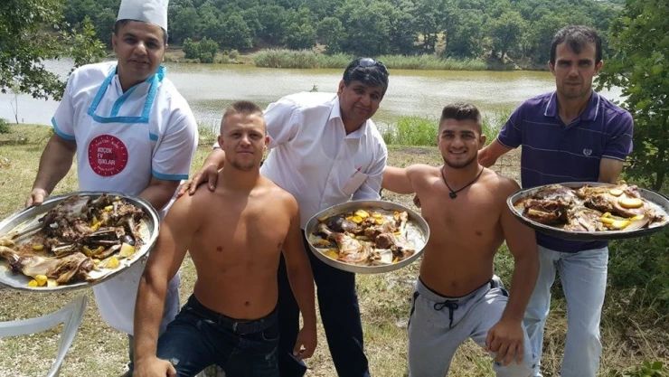Küçük Ev Işıklar Restoran işletmecisi Cevat Işık ve kardeşlerinin Kırkpınar öncesi Şahi Spor pehlivanlarına verdikleri ciğer partisinin ardından şimdi de kuzu ve kebap çeşitlerinden oluşan ziyafet verdi.