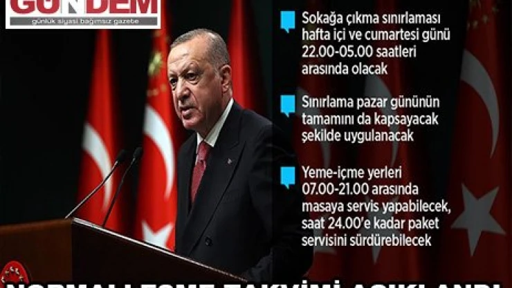 "Haziran ayı boyunca sokağa çıkma sınırlamaları hafta içi ve cumartesi günü akşam 22.00 ile sabah 05.00 saatleri arasında uygulanmaya devam edecektir. Temmuz ayında bu kısıtlama süreleri ve günleri, vaka ve vefat sayılarındaki değişime, aşılamada kat edilen mesafeye göre yeniden belirlenecektir. Yeme-içme yerleri 07.00-21.00 saatleri arasında belirlenen kurallara göre masaya servis yapabilecek, saat 24.00'e kadar paket servisini sürdürebilecek. Bu mekanlarda sokağa çıkma kısıtlaması olan pazar günü ise sadece paket servis hizmeti verilmeye devam edilecektir. Kahvehane, kafe, çay bahçesi, halı saha, spor salonu, lunapark gibi işletmeler kurallar çerçevesinde pazar günü hariç 07.00-21.00 arasında yarından itibaren çalışabilecek. Üniversitelerin 2021-2022 eğitim öğretim yılı akademik takvimi 13 Eylül itibarıyla başlayacaktır. Kamu kurumlarındaki esnek mesai uygulaması yeni bir düzenlemeye kadar devam edecektir. Spor kulüpleri genel kurullarını haziranın ilk gününden itibaren, diğer kuruluşlar da ikinci yarısından itibaren gerçekleştirebileceklerdir. Açık ve kapalı alanlardaki nikahlar ve nikah şeklindeki düğün törenleri, belirlenen şartlara uygun şekilde 1 Haziran'dan itibaren başlayabilecek."