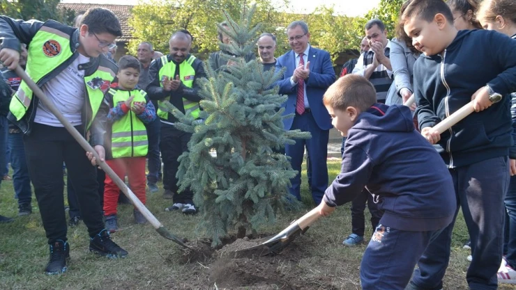 çocuklarla birlikte dikildi. Törene katılan çocukların diktiği fidan, toprakla