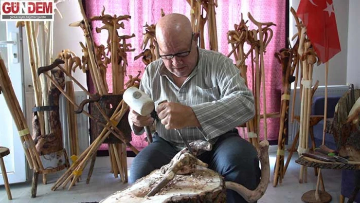 İşin temelini doğru malzemeyi seçmenin oluşturduğunu dile getiren Kaplan, “Çocukken başladım bu işe. Emeklilikten sonra yüzlerce baston yaptım. Ormanda gezinirken uygun dalı bulmak avcı gibi dikkat gerektiriyor. En çok kızılcık tercih ediyorum. Bastonları tek parça olarak yontuyorum. Her ağacın formuna göre farklı figürler ortaya çıkıyor. Bazen bir hayvan, bazen farklı bir desen oluyor. El işçiliğiyle yapıyorum, makinelerle çalışmak bana göre değil. Bıçağımla şekil veriyorum. Gerektiğinde ateşle ağacı ısıtıp eğip biçim kazandırıyorum. Bin adedin üzerinde baston yaptım.” ifadelerini kullandı.