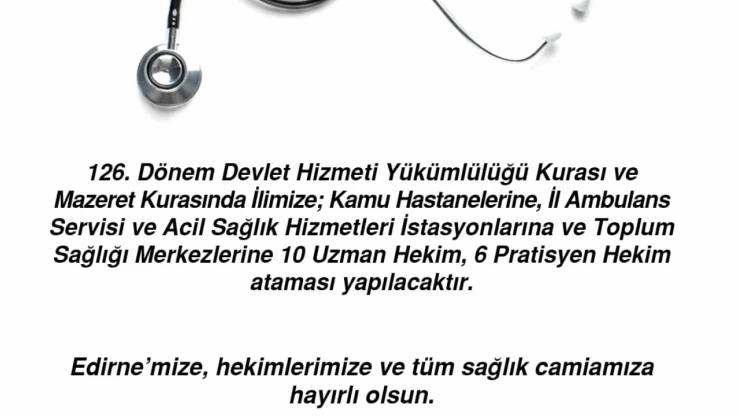 Yapılan açıklamada, 126. Dönem Devlet Hizmeti Yükümlülüğü Kurası ve Mazeret Kurası kapsamında Edirne’ye yeni sağlık personeli kazandırılacağı belirtildi. Buna göre; kamu hastaneleri, İl Ambulans Servisi ve Acil Sağlık Hizmetleri İstasyonları ile Toplum Sağlığı Merkezlerinde görevlendirilmek üzere 10 uzman hekim ve 6 pratisyen hekimin ataması gerçekleştirilecek.