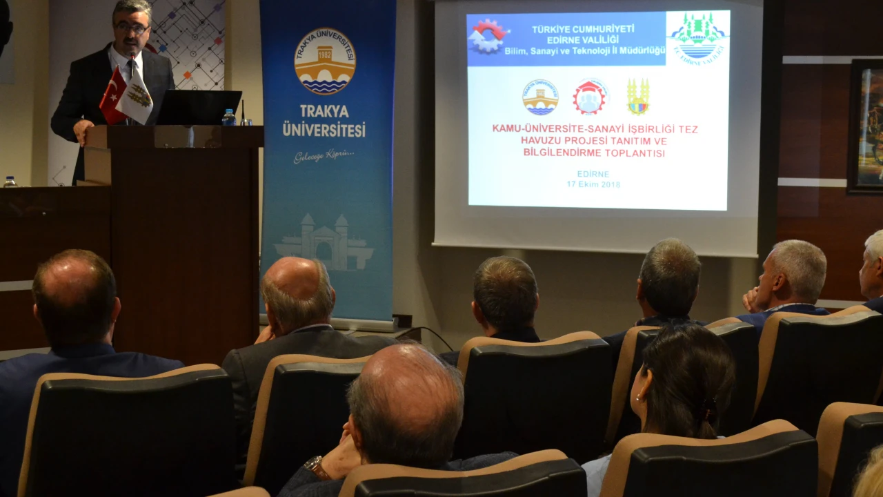 Kamu Üniversite Sanayi İşbirliği(KÜSİ)'nin Sanayi Envanteri bilgilendirme toplantısında sunum yapan KÜSİ İl Başkanı Doç. Dr. Oğuzhan Erdem, Türkiye'de ilk kez Edirne'de uygulamaya geçecek KÜSİ Tez Havuzu'nu tanıttı. Proje ile hazırlanan portalde sanayici tez konusunu önerecek, öğrenci tezi yazacak, öğretim üyesi projesini hazırlayacak ve sanayici-üniversite işbirliğiyle bölge kalkınmasına katkı sunulacak.