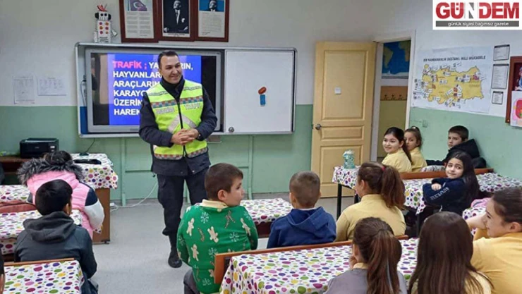Öğrencilere temel trafik kuralları, servis araçlarının kullanımı ve yayaların uyması gereken kurallar hakkında bilgi verildi.