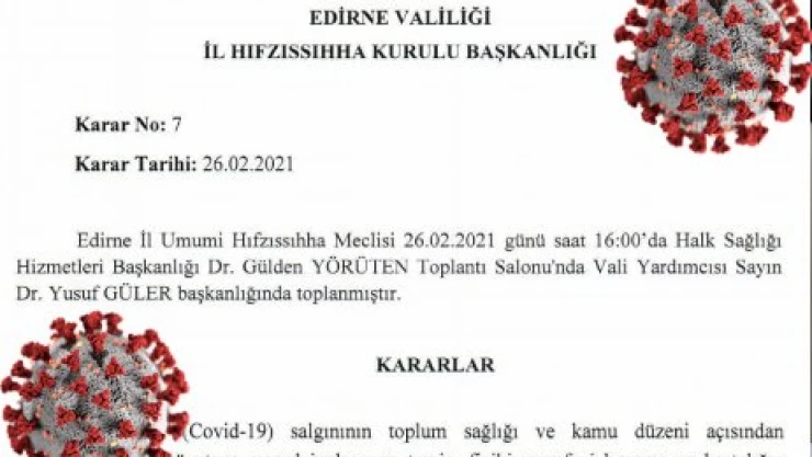 Edirne İl Umumi Hıfzıssıhha Meclisi, 26 Şubat Cuma günü vaka görülen tüm binaların 10 gün süreyle karantina altına alınmasını kararlaştırdı. Kararda orman ve nehir kıyılarının da yasaklanması dikkat çekerken hafta sonu alışveriş merkezlerinin otoparkları kapatıldı. Kararda sinema salonlarına da yer verilmesi dikkat çekti.