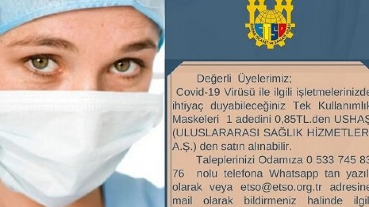 Bir ETSO yetkilisi ise 'Piyasada maske bulunamıyor. Maske karaborsa olmuş. Toptan fiyatına bulabildiğiniz en ucuz maske iki lira civarında. Biz de Oda olarak üyelerimize Sağlık Bakanlığı'nın ilgili bir kuruluşu olan USHAŞ'tan 85 kuruluşa maske temin ediyoruz. Bu hizmete aracılık yapıyoruz ancak odanın bu işten maddi bir çıkarı yok yani ETSO fiyata bir fark koymuyor. Çıkarımız, üyemizin uygun fiyata maske bulup karaborsada çok daha büyük ücretler ödememesidir' dedi.