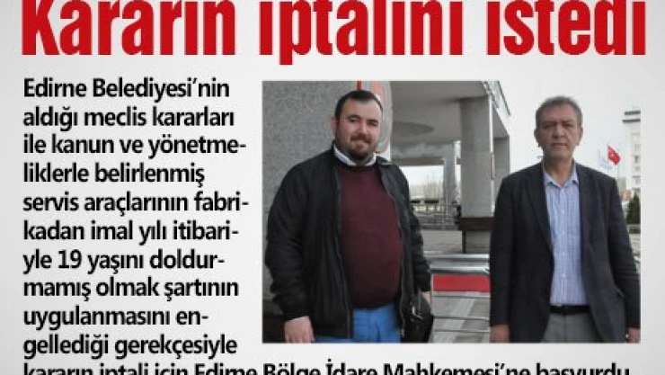 Edirne'de bir araç kiralama firmasının yetkilisi, Edirne Belediyesi'nin aldığı meclis kararları ile kanun ve yönetmeliklerle belirlenmiş servis araçlarının fabrikadan imal yılı itibariyle 19 yaşını doldurmamış olmak şartının uygulanmasını engellediği gerekçesiyle kararın iptali için Edirne Bölge İdare Mahkemesi'ne başvurdu.