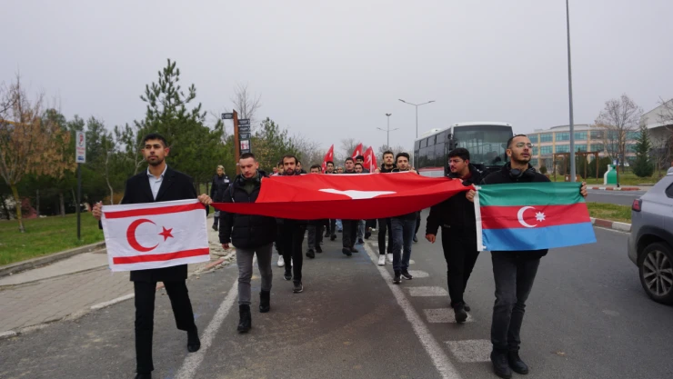 Üniversite yerleşkesinde bir araya gelen öğrenciler ellerinde Türk, Kuzey Kıbrıs Türk Cumhuriyeti, Azerbaycan bayrakları taşıyıp sloganlar eşliğinde yürüyüş yaptı.