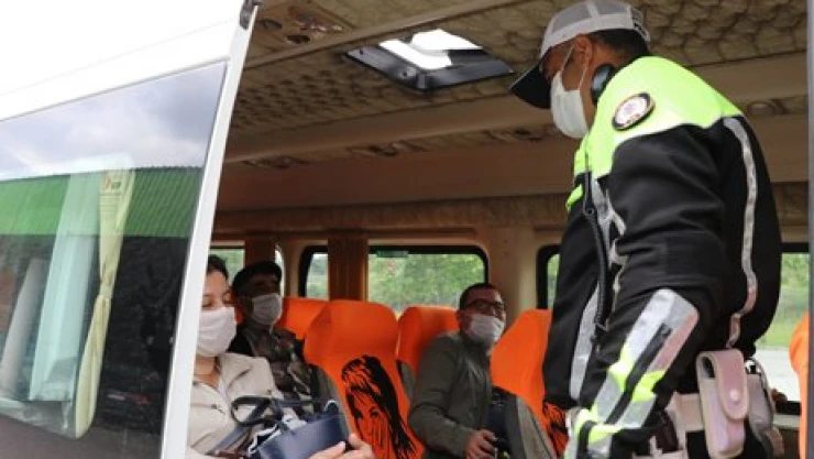 Edirne'de yeni tip koronavirüs (Kovid-19) tedbirleri kapsamında polis ekipleri şehirler arası otobüslerde denetim gerçekleştiriyor. Normalleşme sürecinin başlamasının ardından Edirne'deki Şehirlerarası Otobüs Terminali'nde de yoğunluk yaşanıyor. Edirne Emniyet Müdürlüğü Trafik Tescil ve Denetleme Şube Müdürlüğü ekipleri, hareket saati gelen ve otogara giriş yapan otobüs ve minibüsleri tek tek kontrol ediyor. Ekipler otobüslerde sosyal mesafeli oturma düzeni ve maske kontrolü gerçekleştirirken, vatandaşları koronavirüs tedbirleri hakkında bilgilendiriyor. Polis ekipleri ve otobüs sürücüleri sosyal mesafeli oturma düzenine uymayan yolcuları uyarıyor. Otobüs şoförü Veli Öztürk, yaptığı açıklamada, yeni normal yaşam biçimiyle birlikte otogarda yoğunluk yaşandığını söyledi. Sefere giden araçları sık sık dezenfekte ettiklerini belirten Öztürk, "Yolcularımıza maskesiz araca binmemeleri uyarısında bulunuyoruz. Sosyal mesafeli oturma düzeni uyguluyoruz. Ayırca araca binen her yolcumuza kolonya ikram edip dezenfekte olmalarını sağlıyoruz." dedi.