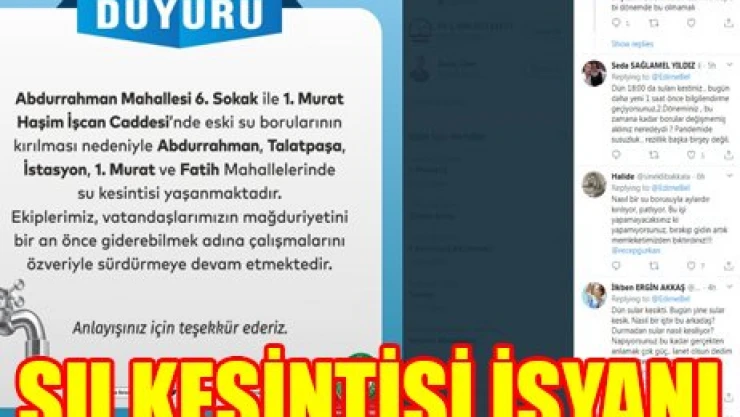 Abdurrahman Mahallesi 6'ncı Sokak ile 1'nci Murat Mahallesi Haşim İşcan Caddesi'nde eski su borularının kırılması nedeniyle Abdurrahman, Talatpaşa, İstasyon, 1'nci Murat ve Fatih Mahallelerinde su kesintisi yaşanınca vatandaşlar isyan etti. Vatandaşlar sosyal medyada Edirne Belediye Başkanı Recep Gürkan'ı eleştirdi.