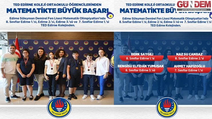 Edirne Süleyman Demirel Fen Lisesi Matematik Olimpiyatları’na katılan 8. Sınıf öğrencilerinden Berk Saygılı birincilik, Naz Su Canbaz ikincilik, Bengisu Elfidan Yumuşak üçüncülük elde etti.