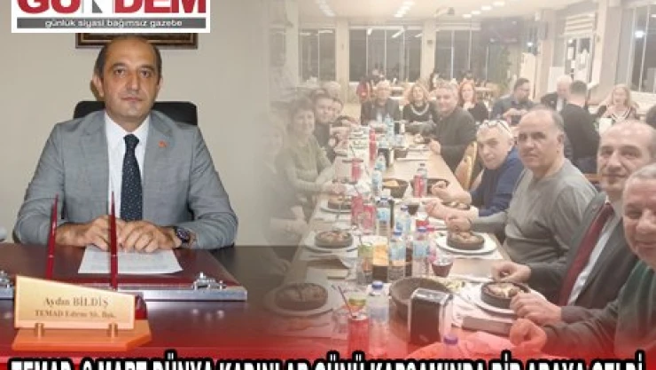 TEMAD Edirne Şubesi üyeleri 8 Mart Dünya Kadınlar Günü dolayısıyla kentte bir restoranda kadın emekli astsubaylar ve eşleri ile yemekte buluştu. Yemekte bir araya gelen Dernek üyeleri eşleriyle beraber Dünya Kadınlar Günü'nü kutladı.