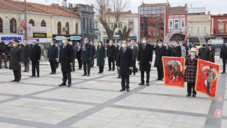 Türkiye Cumhuriyeti'nin kurucusu Mustafa Kemal Atatürk'ün Edirne'ye gelişinin 90'ıncı yıl dönümü, Atatürk anıtında düzenlenen törenle kutlandı. Korona virüsü salgını nedeniyle sosyal mesafe, maske ve hijyen tedbirleriyle düzenlenen törene Edirne Valisi Ekrem Canalp, Garnizon Komutanı Tuğgeneral Mehmet Cihanoğlu ve Belediye Başkanı Recep Gürkan anıta çelenk sundu.