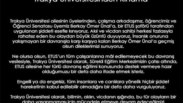 Trakya Üniversitesi Rektörlüğü, bünyesindeki Armağan Dönertaş Engelli Çocuklar Rehabilitasyon Uygulama ve Araştırma Merkezi'nde öğretmen olarak çalışan yüzde 50 görme engelli 25 yaşındaki öğretmen Berkay Ömer Ünal'ın Edirne'deki şehiriçi ulaşım sistemini yürüten ETUS'un bir minibüsünde şoför tarafından dövülmesi olayını yazılı açıklama ile kınadı. Açıklamada, T.Ü.'nin, Sürekli Eğitim Merkezi'nde, ETUS şoförlerine her türlü davranış eğitimi konusunda destek vermeye hazır olduğu vurgulandı.