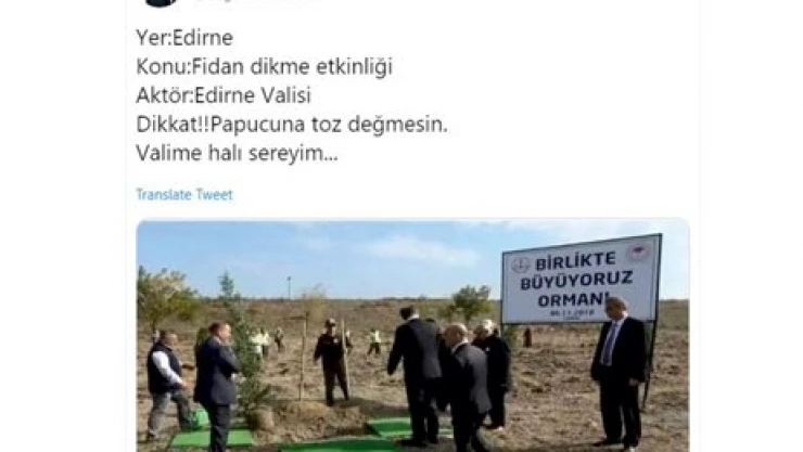 Cumhuriyet Halk Partisi (CHP) İstanbul Milletvekili Özgür Karabat'ın resmi Twitter hesabında Edirne Valisi Ekrem Canalp'i hedef alarak yaptığı paylaşım gündem oldu. Karabat, Vali Canalp'in Edirne'de görev başlamasının ertesi günü katıldığı Tarım ve Orman Bakanlığı, Milli Eğitim Bakanlığı'nın Türkiye genelinde ortak düzenlediği ilk ve ortaokul öğrencilerine yönelik, 'Fidanlar Fidanlarla Büyüyor' projesi kapsamında fidan dikimine katıldığı fotoğrafını 'Yer: Edirne, Konu: Fidan dikme etkinliği, Aktör: Edirne Valisi Dikkat!! Papucuna toz değmesin. Valime halı sereyim...' başlığıyla paylaştı. Karabat'ın ardından CHP Genel Başkanı Kemal Kılıçdaroğlu'nun Başdanışmanı Deniz Demir de aynı fotoğrafı 'Edirne'de fidan dikme etkinliğinde Vali Bey'in ayakkabıları kirlenmesin diye protokol halısı serilmiş. Bu kadarına da pes artık' başlığıyla paylaşması üzerine paylaşımlar hızla çoğaldı. Bazı kullanıcılar ise Karabat ve Demir'in paylaşımına tepki gösterdi. Vali Canalp'in bu şekilde bir talimatı olmadığını ifade eden kullanıcılar, Canalp'in yere serilen halıları talimat vererek kaldırttığını ifade etti, Karabat, Demir ve benzer paylaşımlarda bulunanları kınadı.
