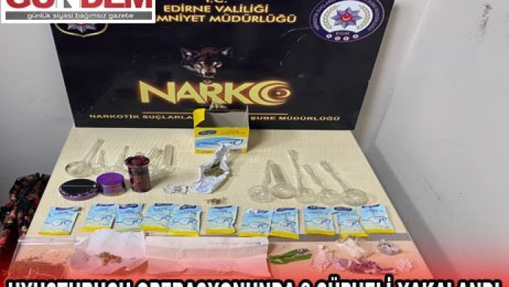 İl Emniyet Müdürlüğü Kaçakçılık ve Organize Suçlarla Mücadele Şubesi ekipleri, Uzunköprü ilçesinde şüphelilerin Habib Hoca Mahallesi'ndeki evlerinde arama gerçekleştirdi. Aramada 60 gram uyuşturucu, 12 uyuşturucu içme aparatı ve uyuşturucu yapımında kullanılan makine ele geçirildi. Gözaltına alınan şüpheliler D.D ve U.S'nin emniyetteki işlemleri sürüyor.