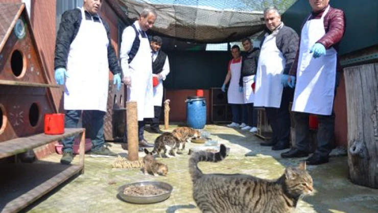 esnafları, kedilere ciğer ikramının ardından barınakta bulunan köpeklere de